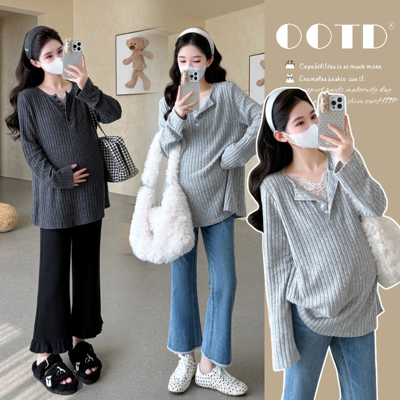 孕妇t恤秋装长袖韩版宽松休闲蕾丝拼接V领体恤短款上衣孕妇装秋季