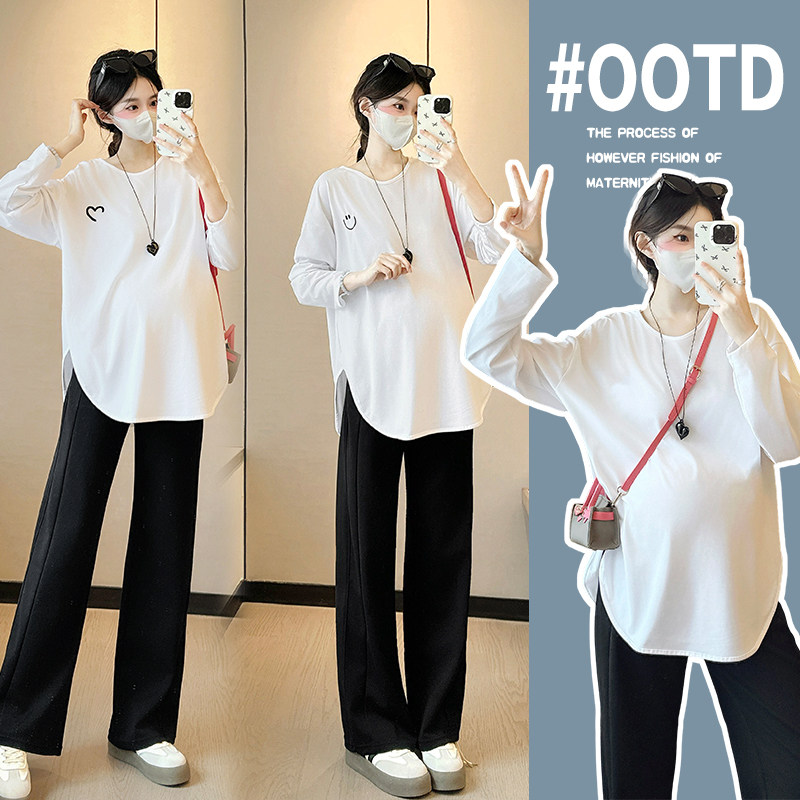 孕妇早秋装外穿上衣白色打底衫孕期宽松休闲体恤春秋长袖T恤百搭