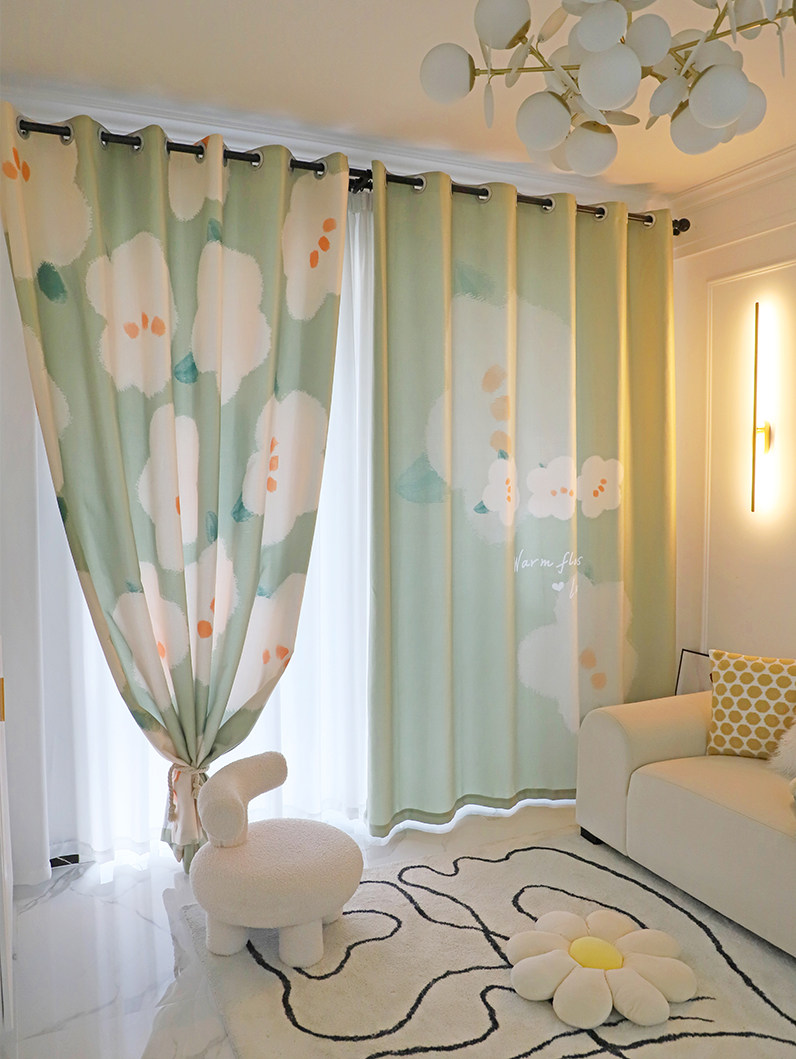 北欧韩式抹茶绿花朵客厅少女卧室儿童房女孩棉麻窗帘遮光布免打孔