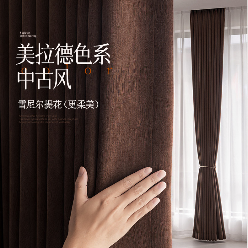 美拉德棕雪尼尔麻窗帘遮光2025新款卧室绍兴柯桥工厂客厅全屋定制