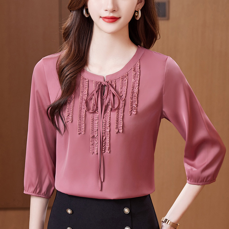 蝴蝶结雪纺衫七分袖女春秋木耳花边法式衬衣大码上衣打底洋气小衫