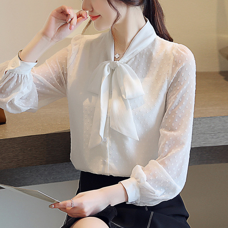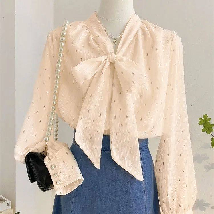 一线撤柜女装法式复古设计感飘带波点微透薄衬衫宽松蝴蝶结雪纺衫