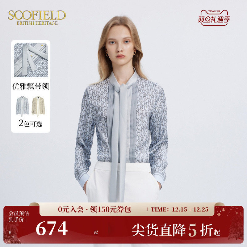 Scofield女装蝴蝶结飘带领压褶雪纺衫优雅锁链logo印花衬衫秋季