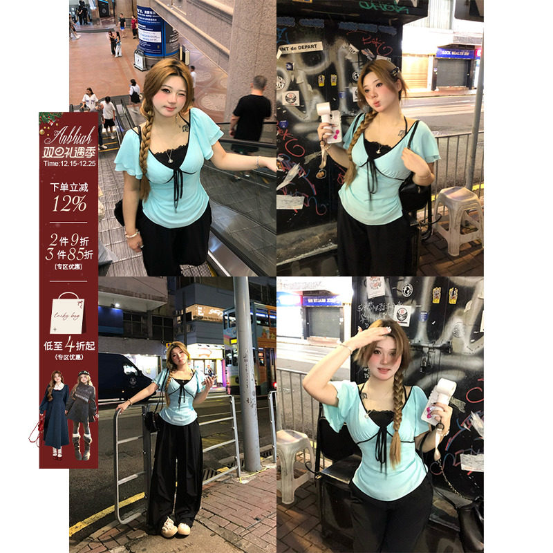 安妮不火 甜梨汽泡日杂美女蝴蝶结雪纺衫女微胖大码纯欲短袖小衫