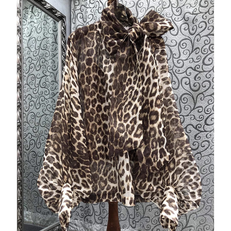 澳洲小众设计秋季新款丝麻系带豹纹灯笼袖上衣女宽松蝴蝶结雪纺衫
