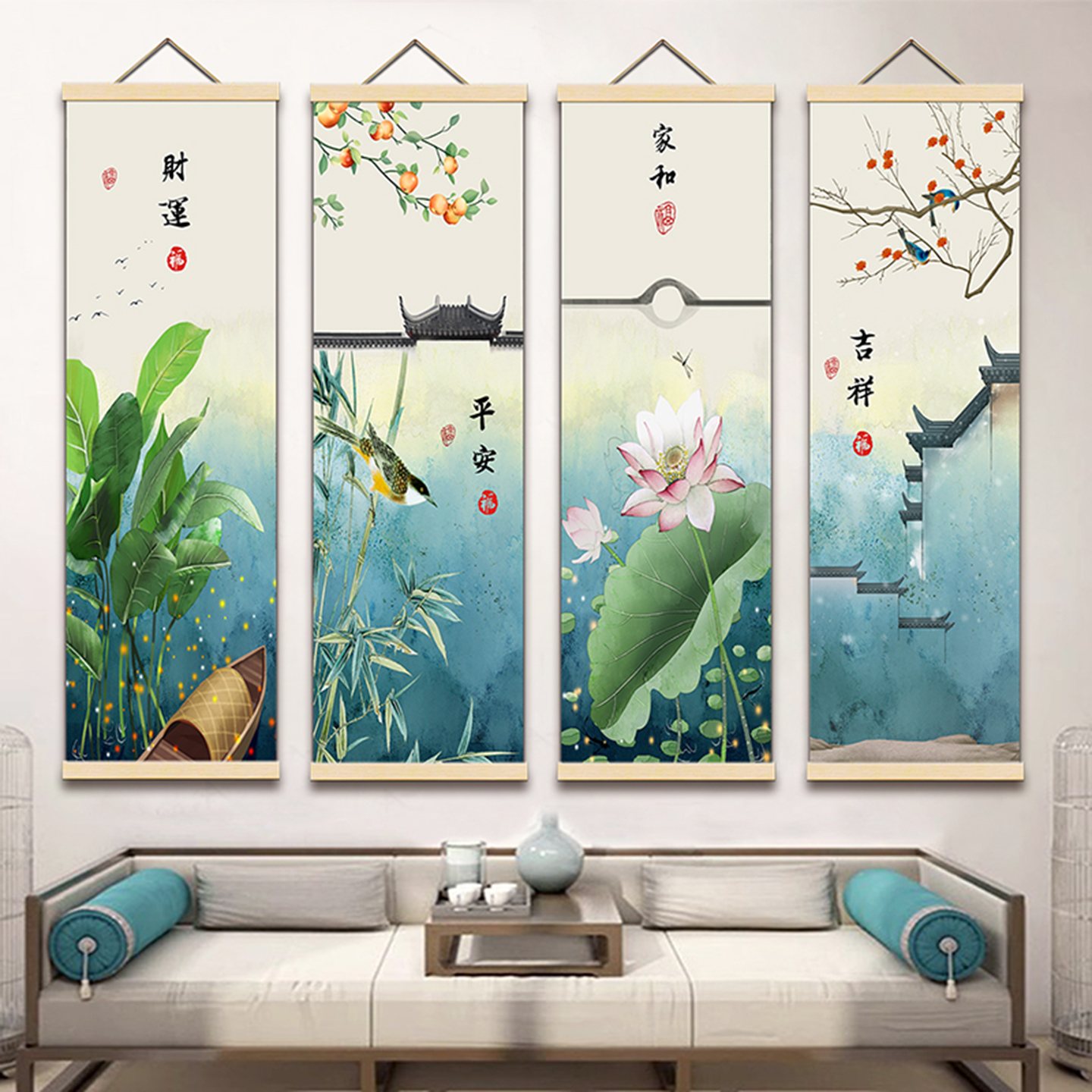 WBZ7新中式书房客厅装饰画四条屏长条国画四联梅兰竹菊挂画卷轴字