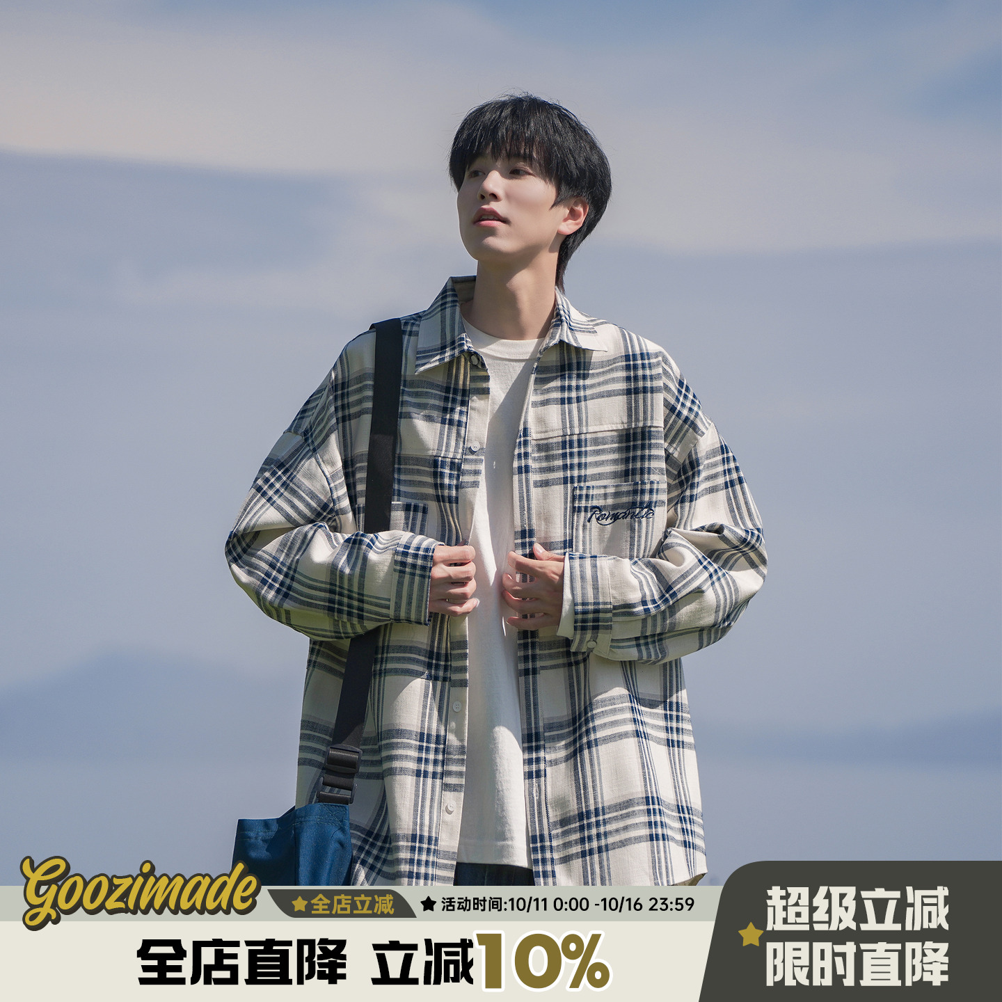 GOGOSOON春秋新款男生衬衫外套加厚呢料格子复古青少年休闲宽松潮