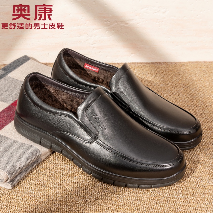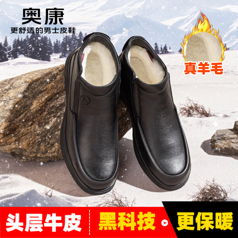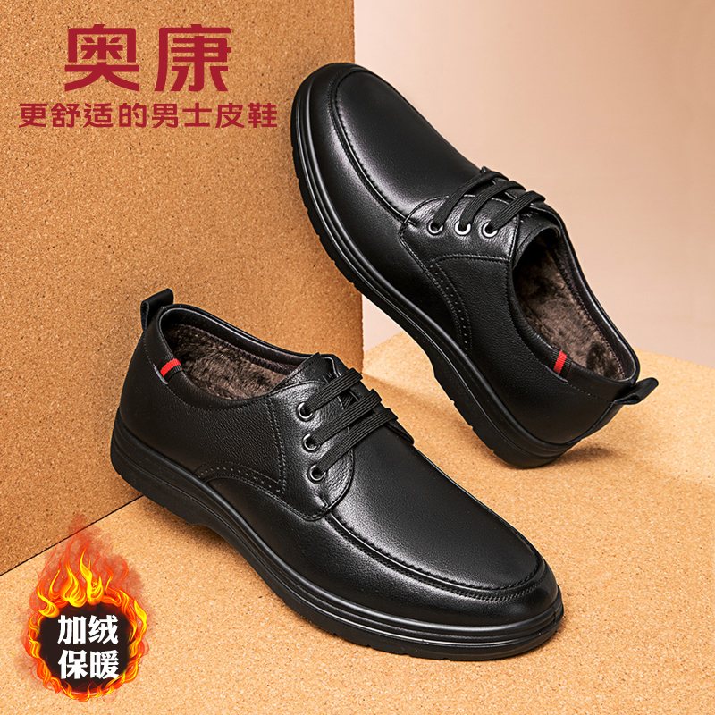奥康皮鞋男款冬季加绒商务休闲鞋真皮舒适中年爸爸鞋羊毛保暖棉鞋