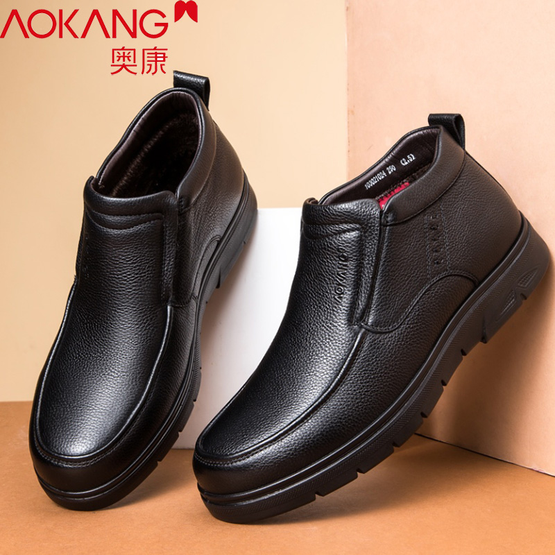 奥康皮鞋男冬季加绒真皮软底爸爸鞋男士保暖防滑宽脚中老年二棉鞋