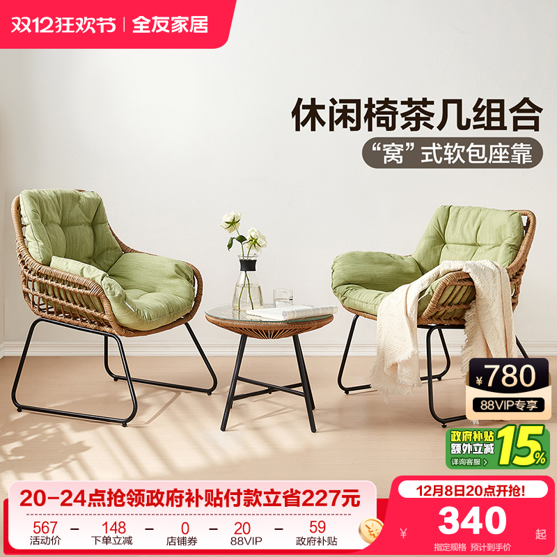 全友家居藤椅三件套休闲阳台客厅高弹坐垫桌椅简约小茶几组合KS