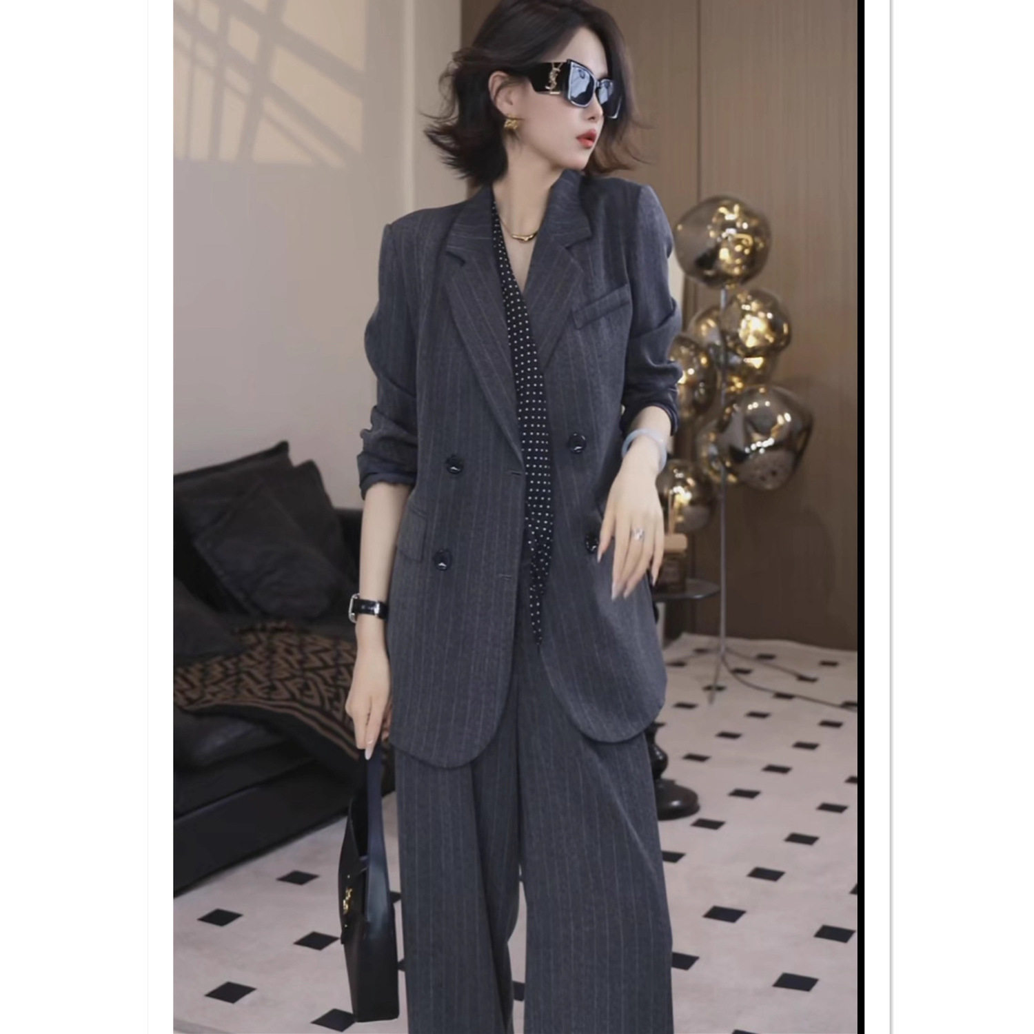 名师路条纹职业女装西服套装阔腿长裤两件套中长款外套女春秋新款