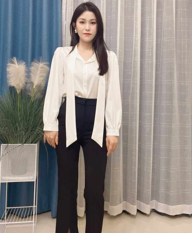 韩范职业OL法式黑色长裤小黑裤简约飘带领泡泡袖衬衫两件套装女装