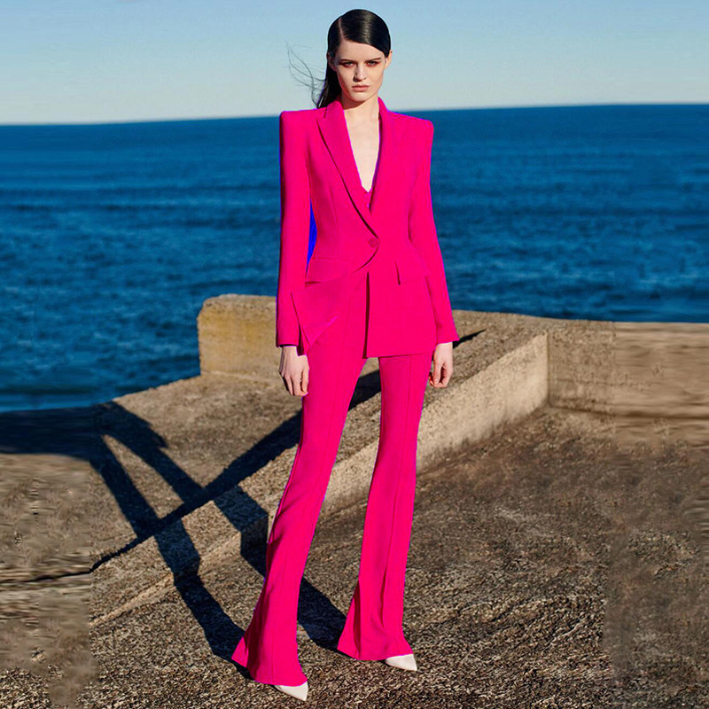 一粒扣纯色气质西服喇叭长裤套装欧美潮款时尚职业女装西装两件套