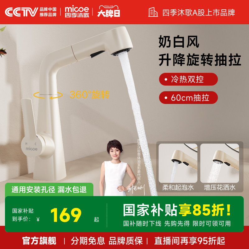 四季沐歌奶白色升降抽拉龙头洗脸盆洗手盆水龙头冷热水卫生间家用