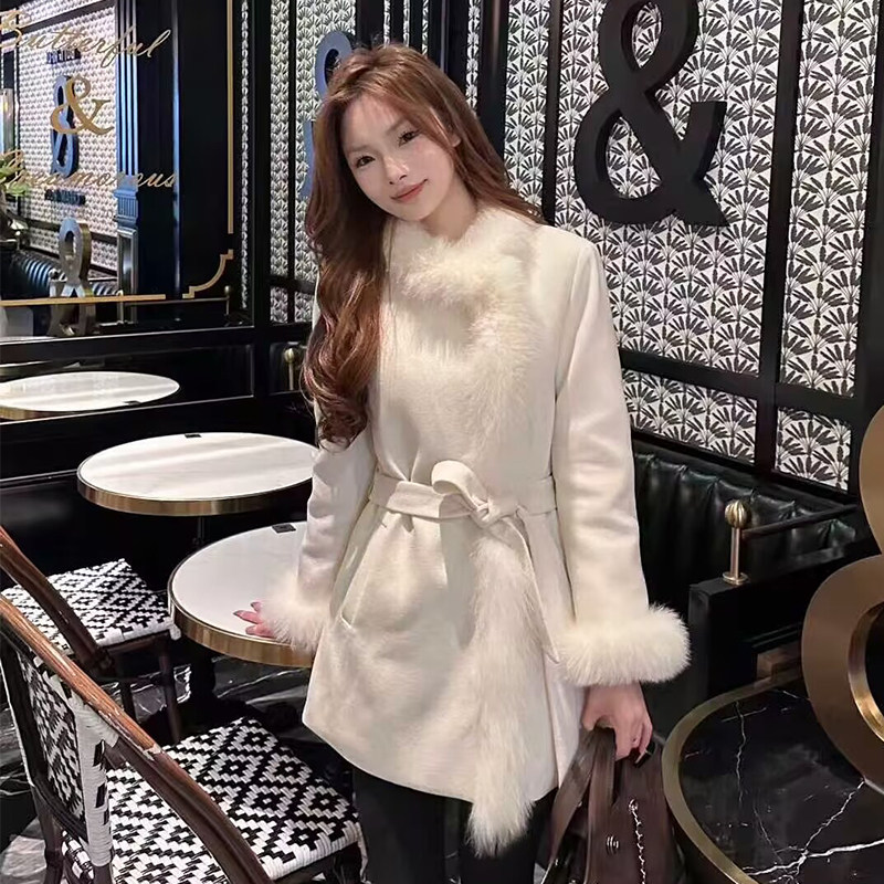 韩国东大门狐狸毛领围巾双面羊绒毛呢大衣外套女中长款气质2025冬