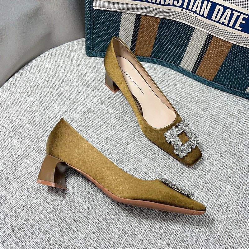 绿色高跟鞋粗跟2024新款法式气质水钻方头M职业通勤工作中跟单鞋