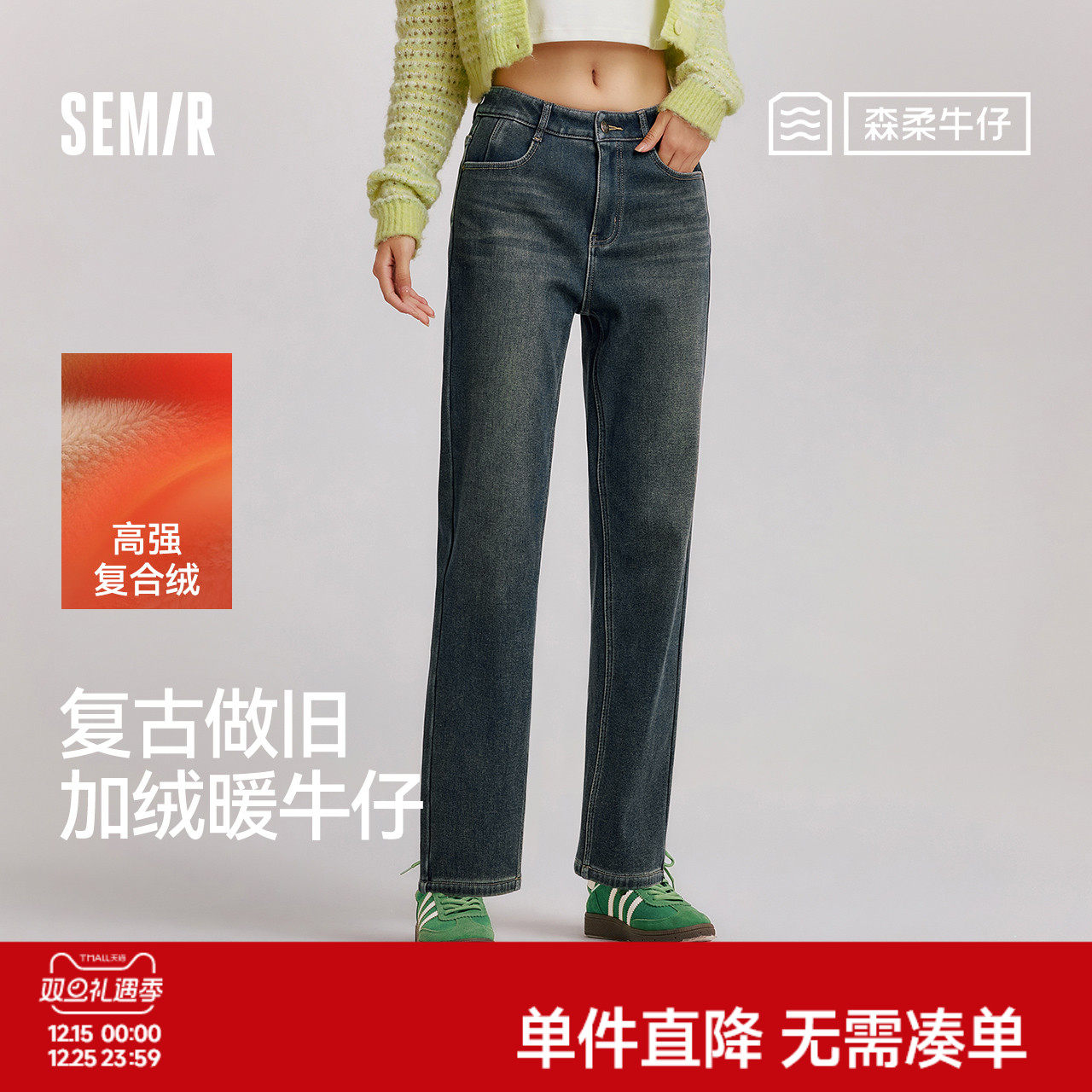 森马牛仔裤女冬加绒做旧长裤女生保暖显腿长ins潮街头复古直筒裤