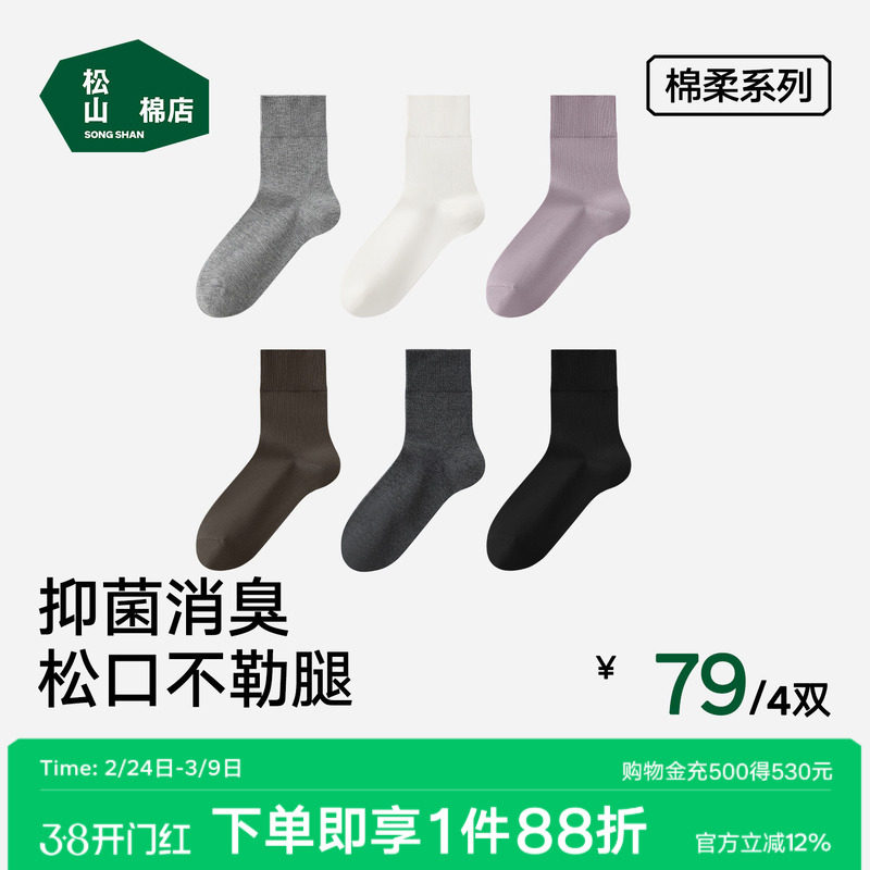松山棉店松口袜纯棉中筒袜抗菌消臭男女袜子柔软透气纯色百搭棉袜