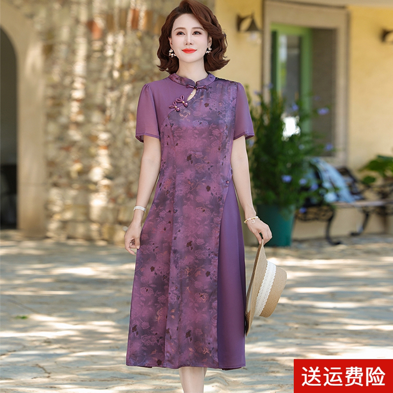 依佈中老年妈妈装真丝连衣裙夏季新款新中式改良旗袍裙桑蚕丝裙子