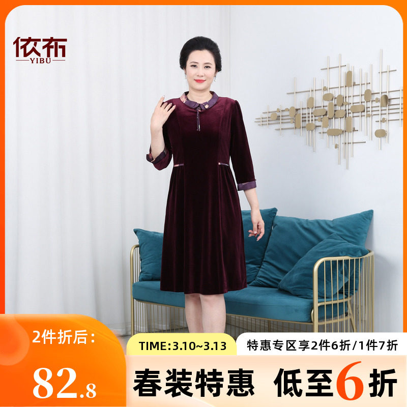 依佈中老年女士气质丝绒连衣裙2026春装新款礼服裙妈妈装中长裙子