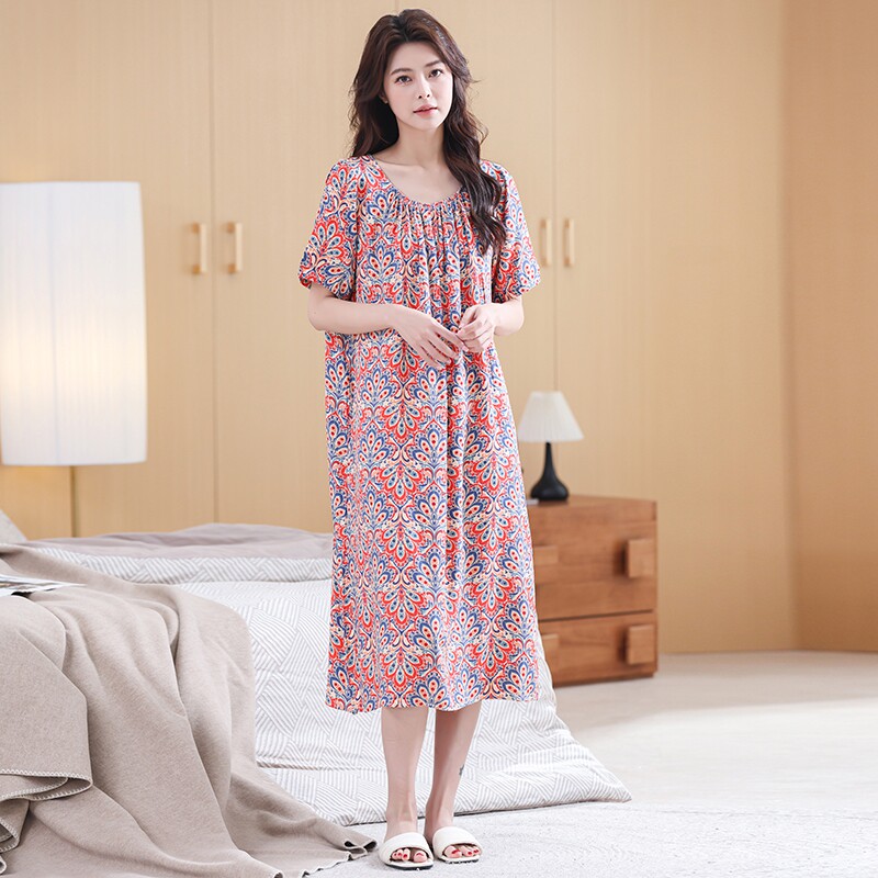 妈妈装夏季家居服连衣裙中长款宽松睡裙短袖棉绸裙子防凸点女士裙