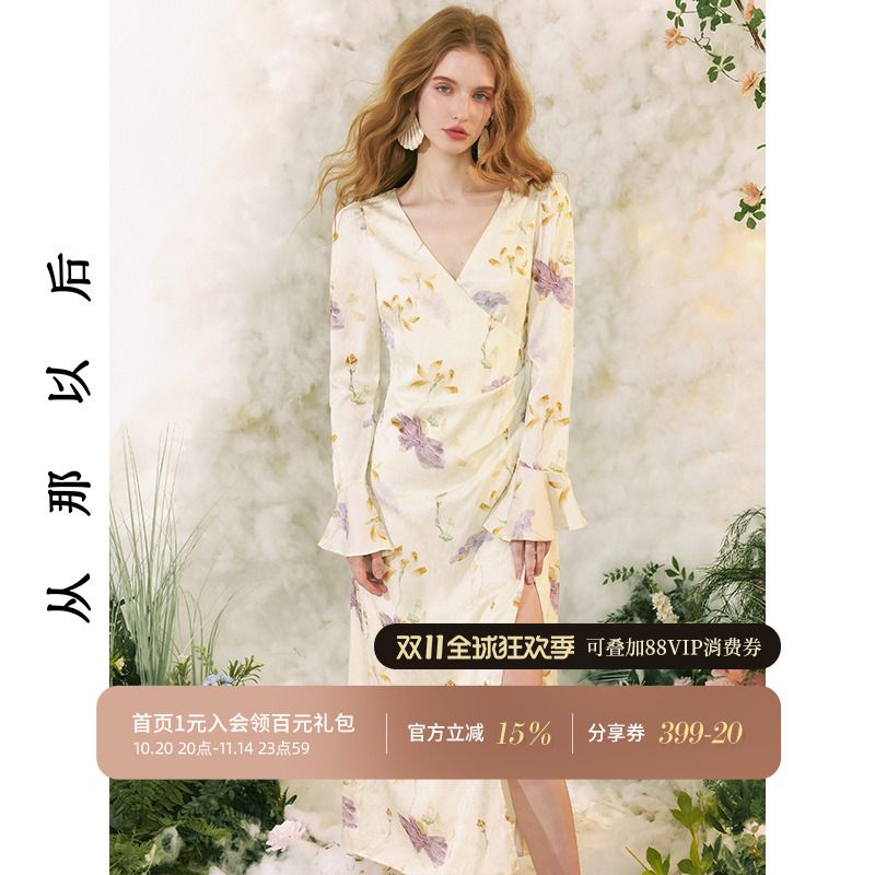 从那以后法式风碎花旗袍裙春收腰长袖连衣裙初春长裙小裙子女春季