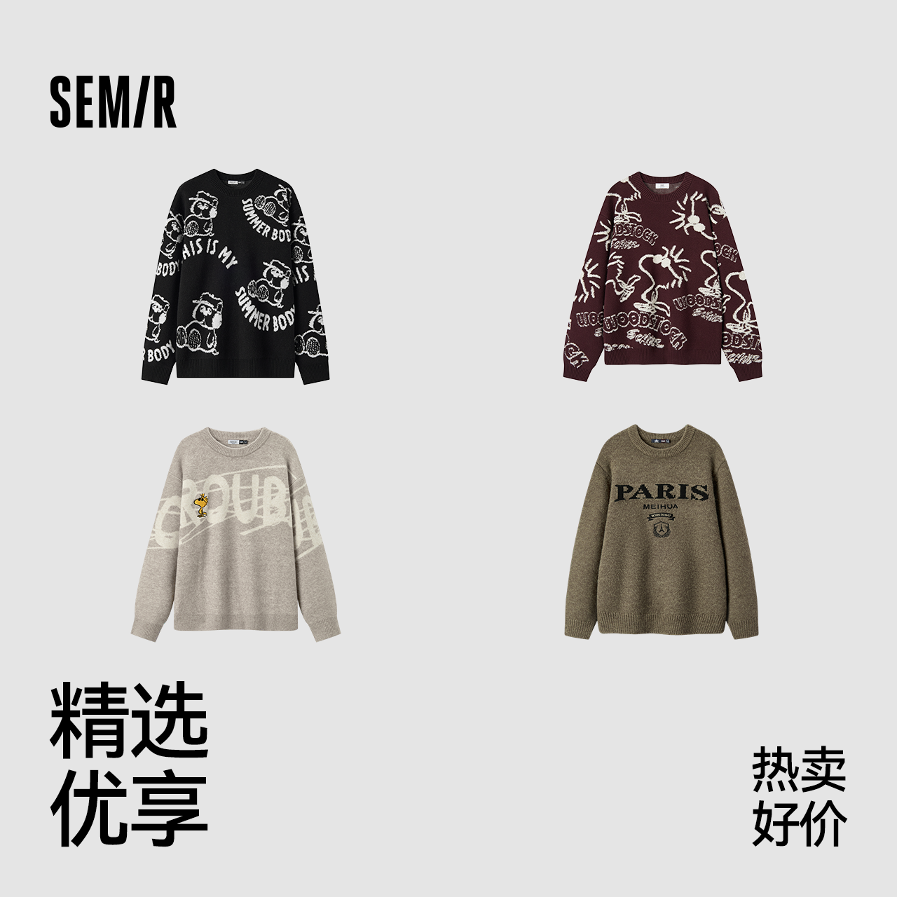 森马史努比系列毛衫男冬季满版提花针织衫撞色情侣毛衣宽松套头衫