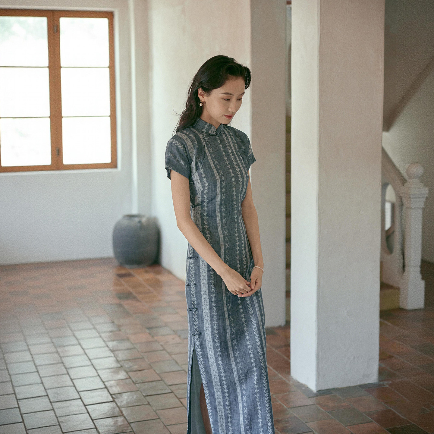 茉茉旗袍 小连袖有省侧拉链中长款复古日常改良弹力亚麻旗袍 书蓝