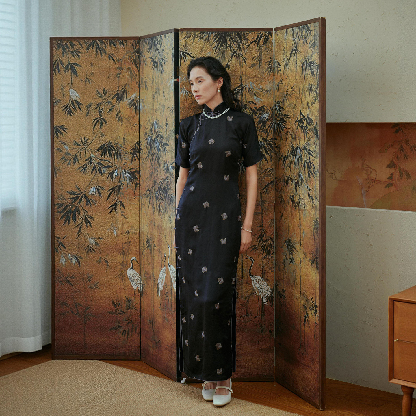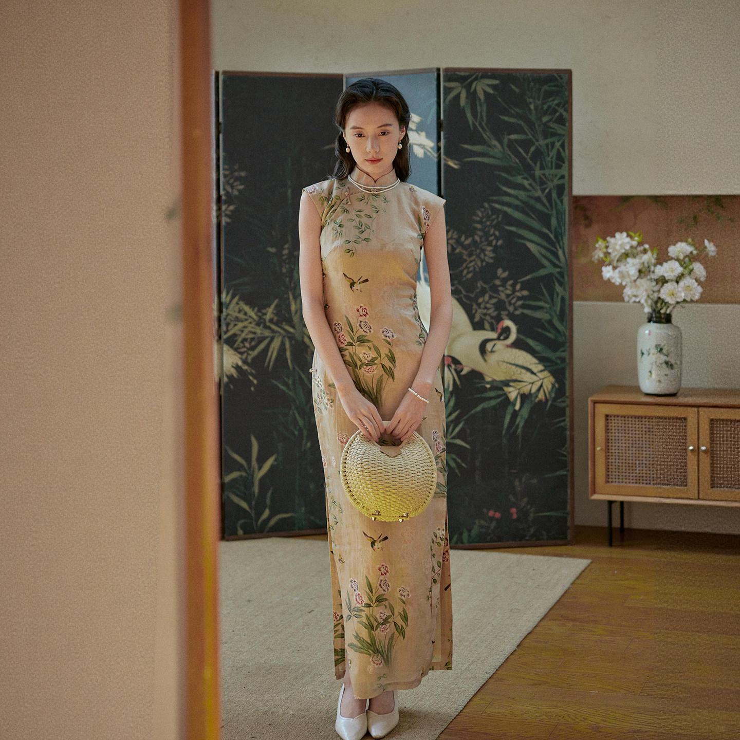 茉茉旗袍春新 无袖有省半开襟盘扣长款 复古日常天丝旗袍 花钿