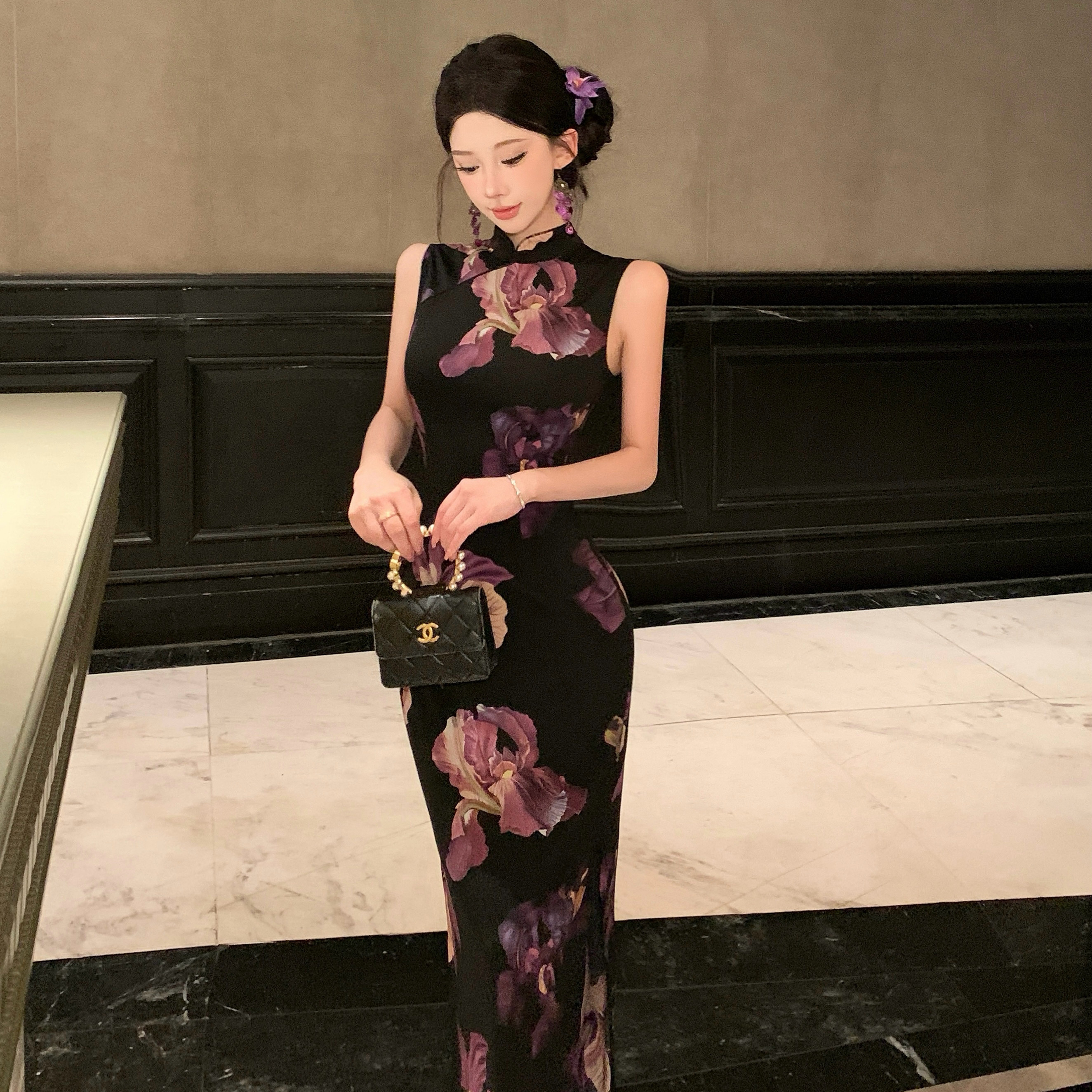 紫色蝴蝶国风中式长款无袖改良旗袍2026新款年轻款女复古修身日常