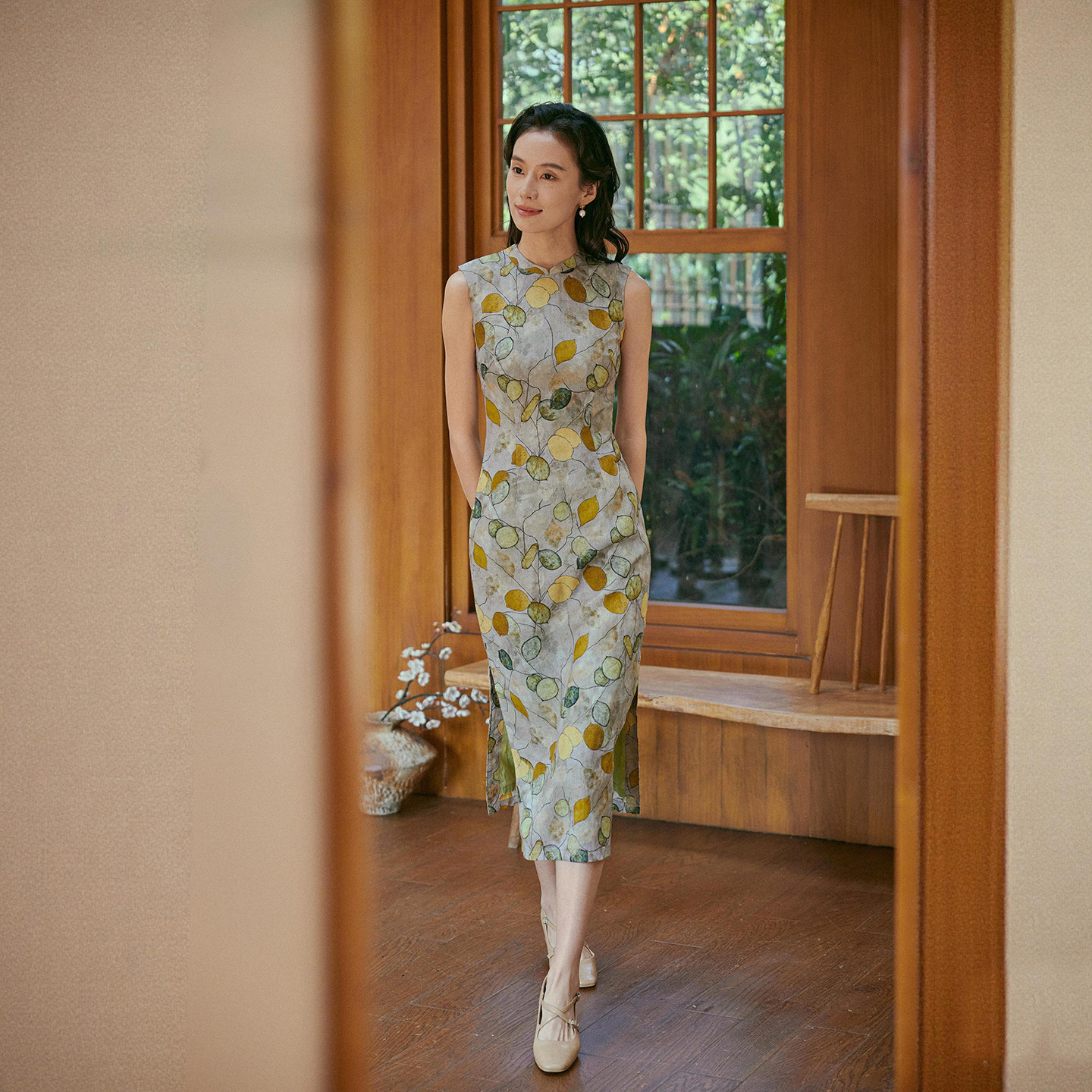 茉茉旗袍春新 低领无袖有省侧拉链中长款 复古日常丝麻港式 柠叶
