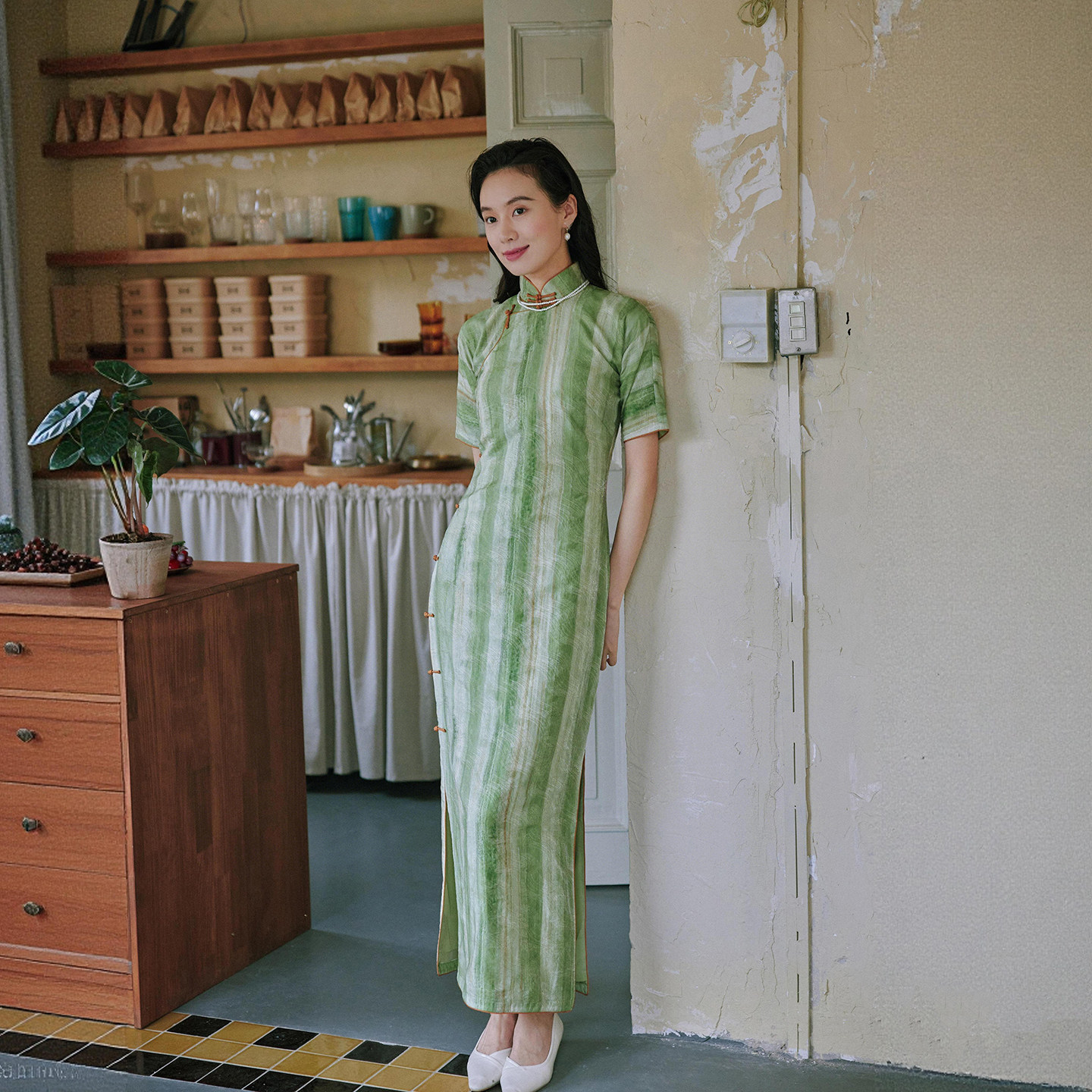 茉茉春夏 小连袖无腰省全开襟长款 复古日常条纹棉绸老旗袍 时歌