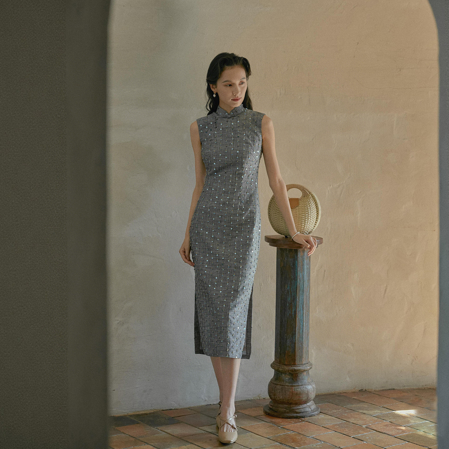 茉茉旗袍春新 港式无袖有省侧拉链中长款 复古日常亮片 港口的夜