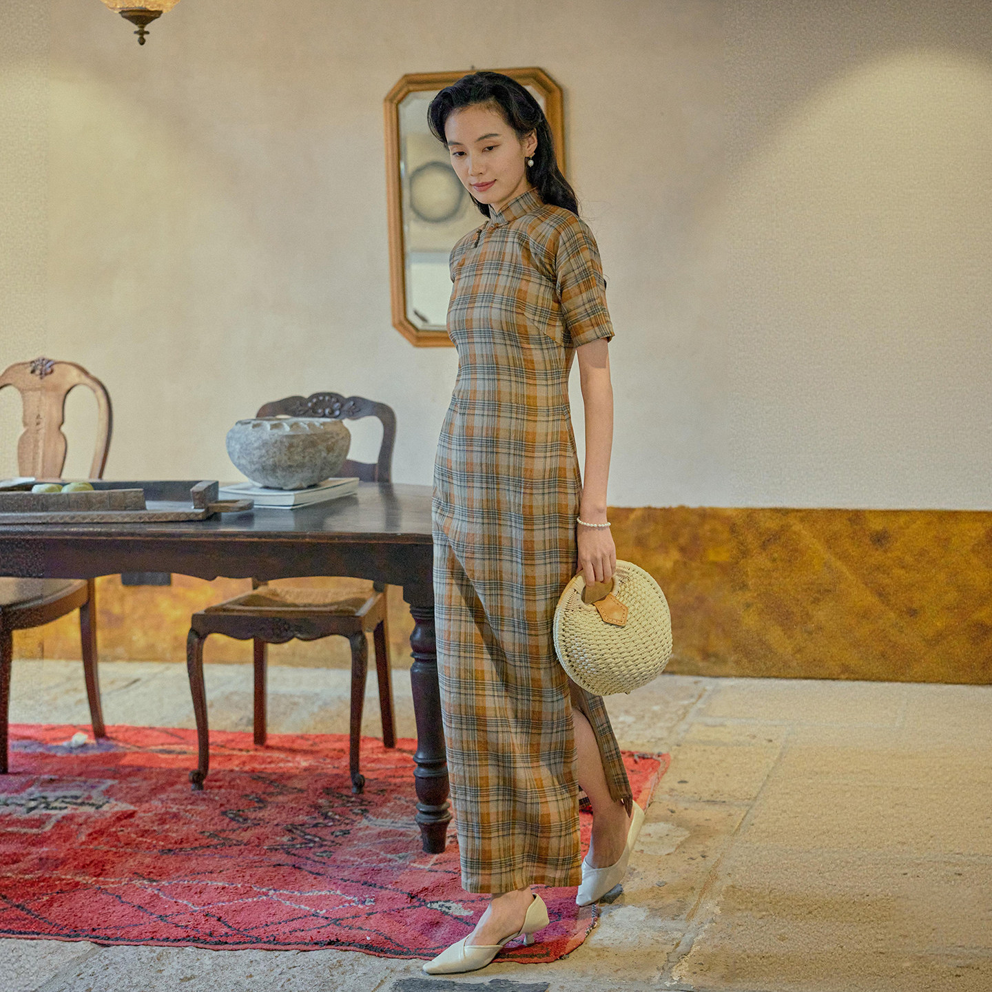 茉茉旗袍春新 四分连袖全开襟盘扣长款复古日常气质格子丝麻 徽音