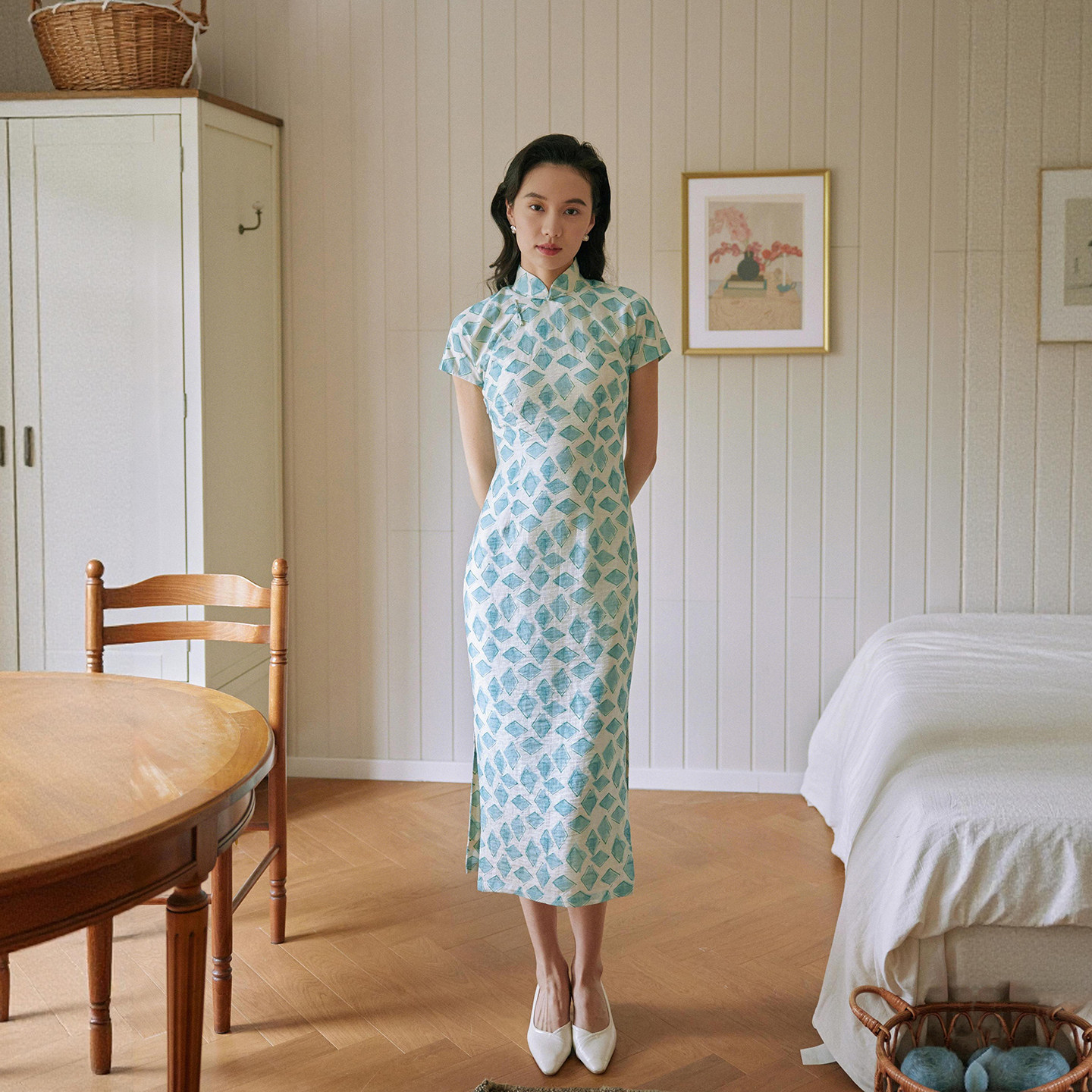 茉茉旗袍春新 港式短袖连袖有省侧拉链中长款 复古日常天丝 菱月