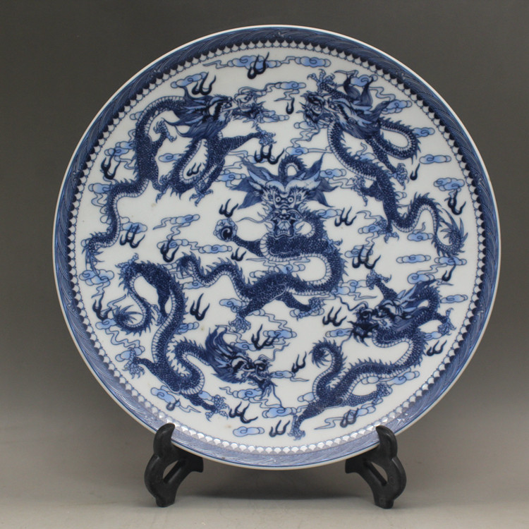 复古青花五龙盘直径26厘米仿古瓷器玄关摆件桌面陶瓷坐盘家居饰品