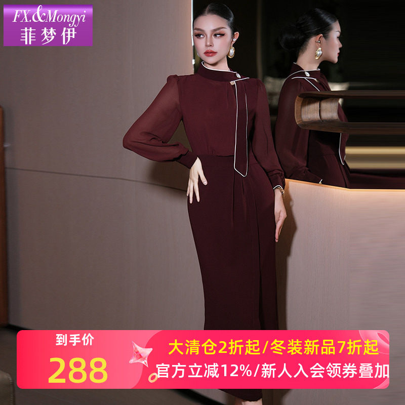 菲梦伊红色连衣裙女长袖秋装新款复古别致收腰简约气质衬衫中长裙