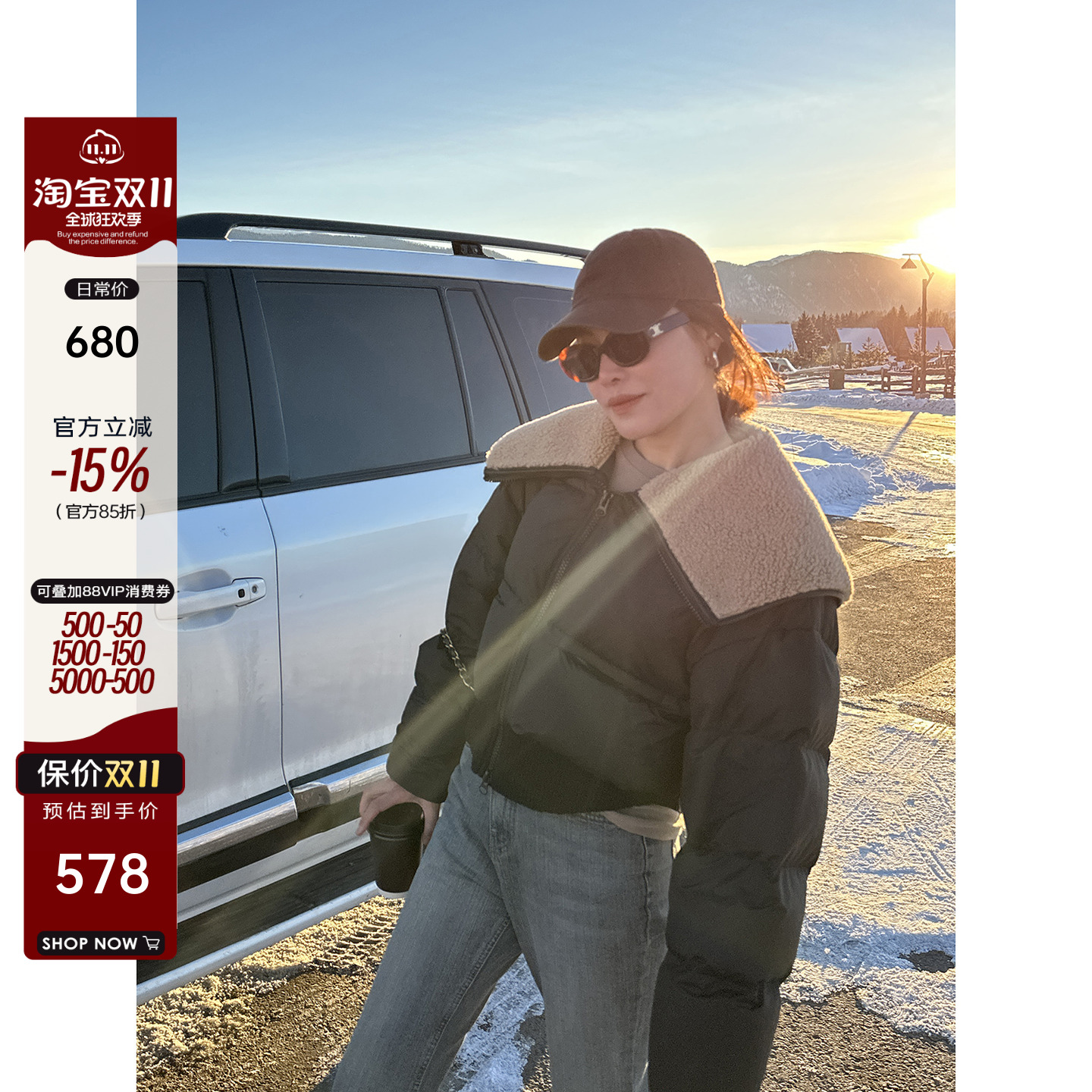 YANGLE_翻领羽绒服女2025年冬季新款羊羔毛拼接保暖短款羽绒外套