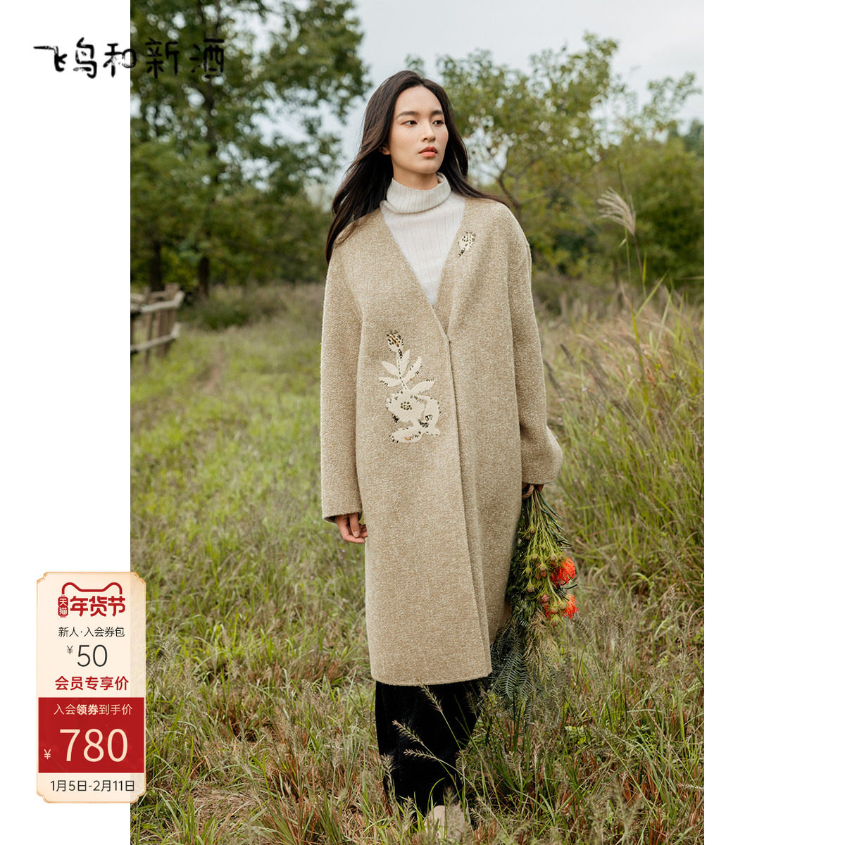 飞鸟和新酒商场同款女装新款宽松中长款毛呢大衣女FZ470051010