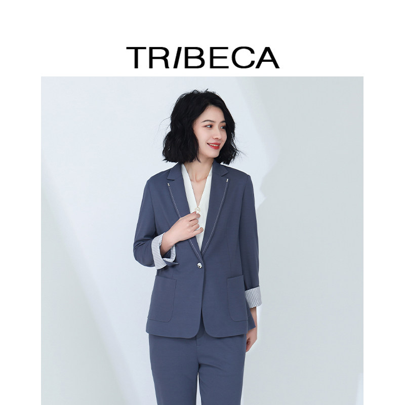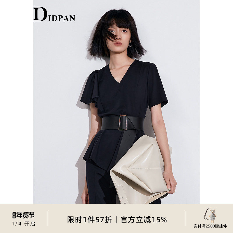 IDPAN商场同款女装设计感藏青荷叶边袖下摆高级感上衣+裤子套装女