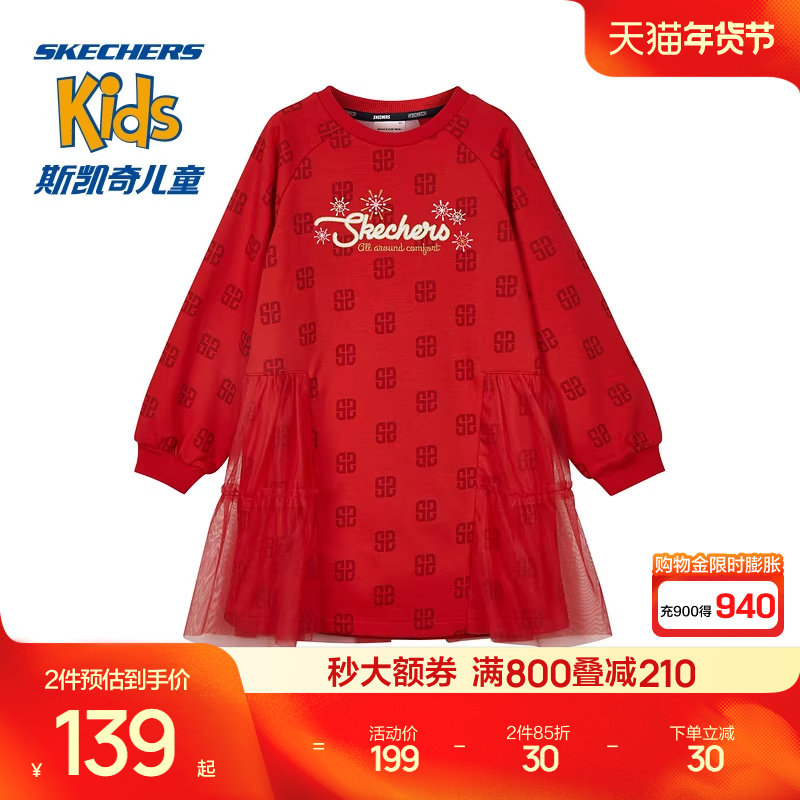 斯凯奇新年童装商场同款女童圆领连衣裙新年本命年红色公主风纱裙