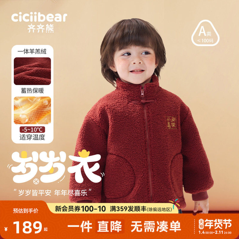 [岁岁衣新年羊羔绒]齐齐熊宝宝摇粒绒外套男童秋冬儿童红色一体绒