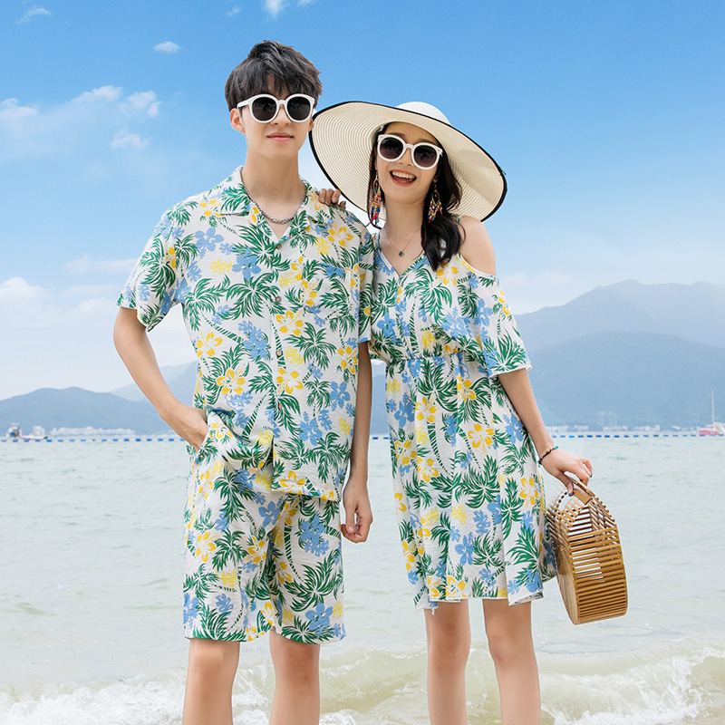 三亚旅行情侣装夏装男夏威夷花衬衫海边度假女沙滩连衣裙一衣一裙