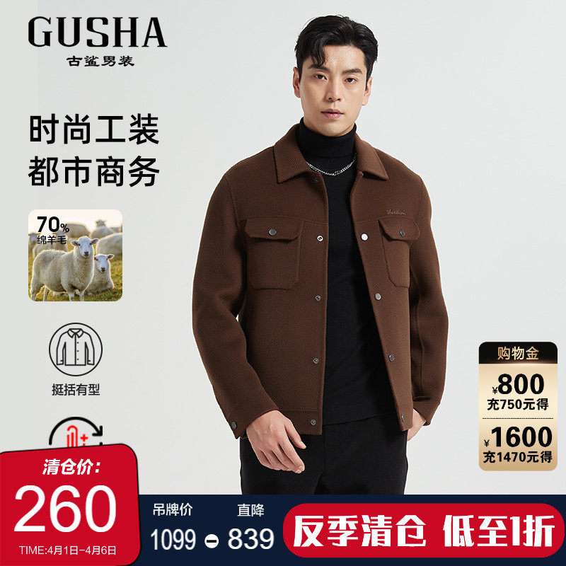 【双面呢】古鲨时尚翻盖羊毛呢男商务墨绿韩版翻领夹克2025冬装装
