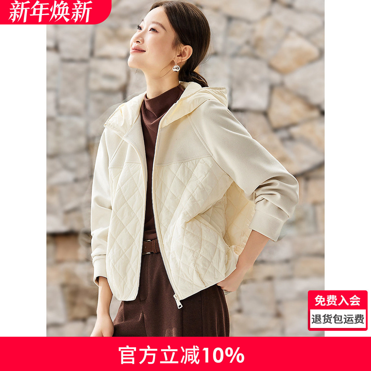沫晗依美奶油泡芙感棉服2025冬季新款轻薄短款绗棉拼接连帽外套女