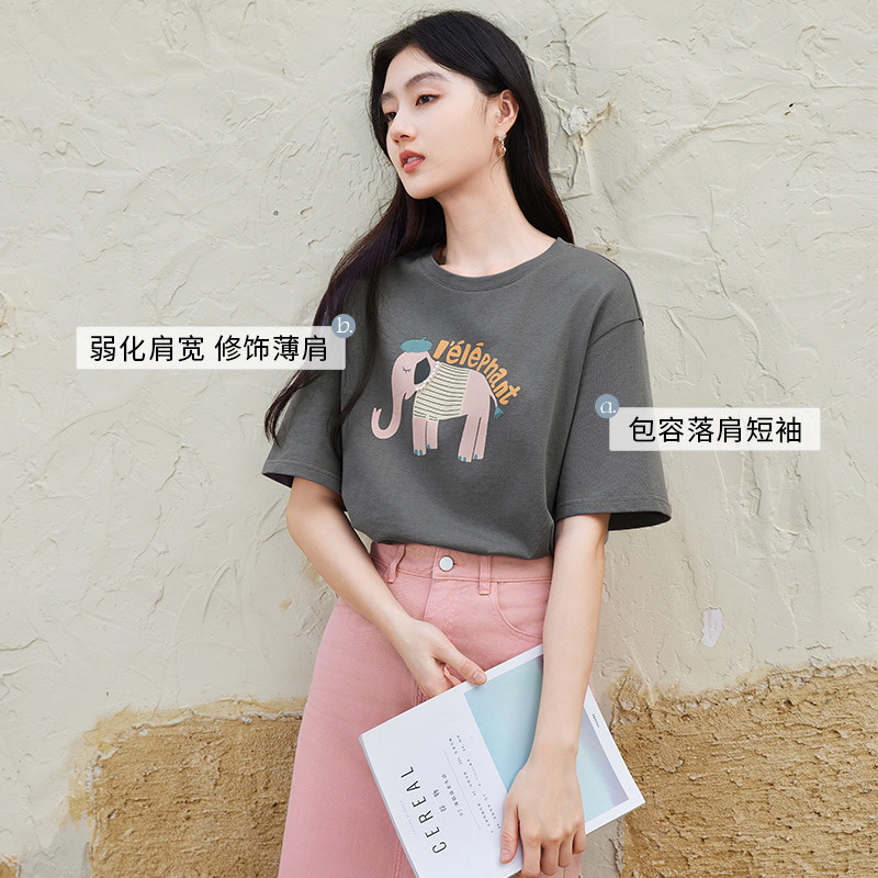 香影卡通小象灰色纯棉t恤短袖女2025夏季新款超好看圆领落肩上衣