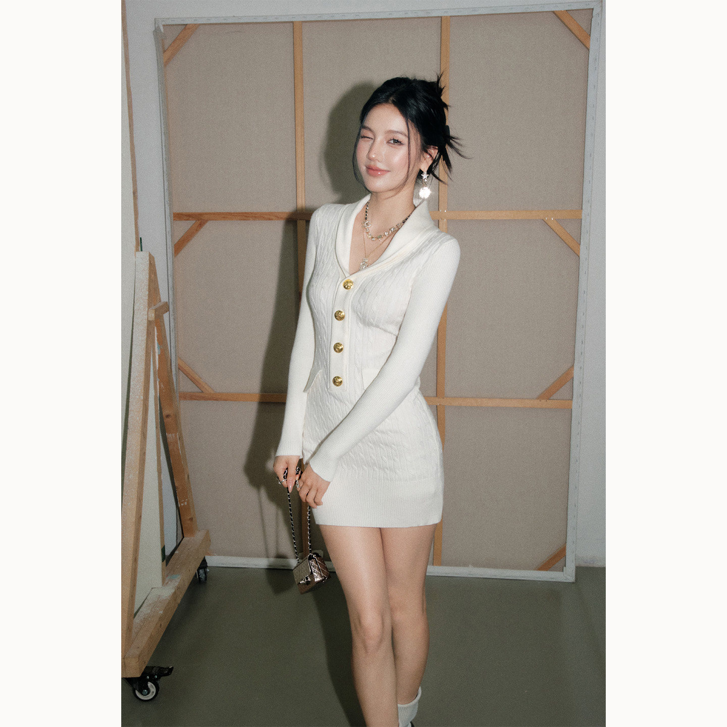 OLIVIA DUO翻领针织连衣裙2026春季新款法式修身显瘦打底包臀裙