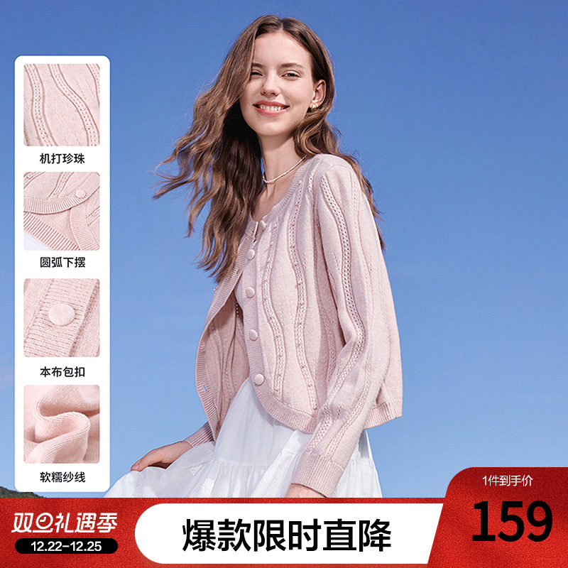 太平鸟 miu圆领绞花针织开衫女士秋品质软糯格雷系针织毛衫外套*