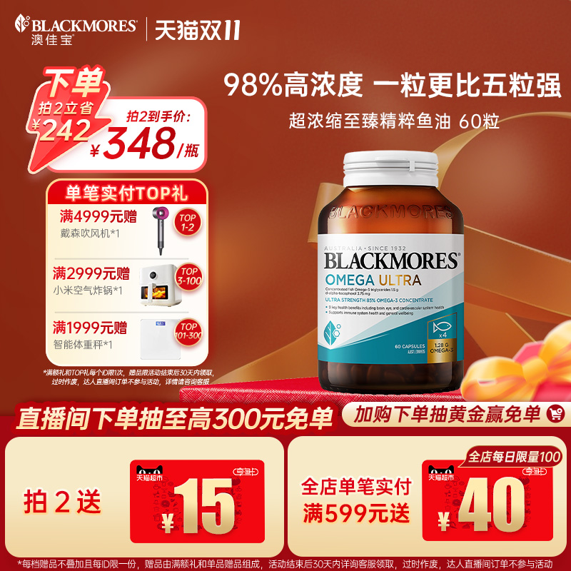 【自营】BLACKMORES澳佳宝4倍高浓度深海鱼油*2瓶DHA omega-3四倍