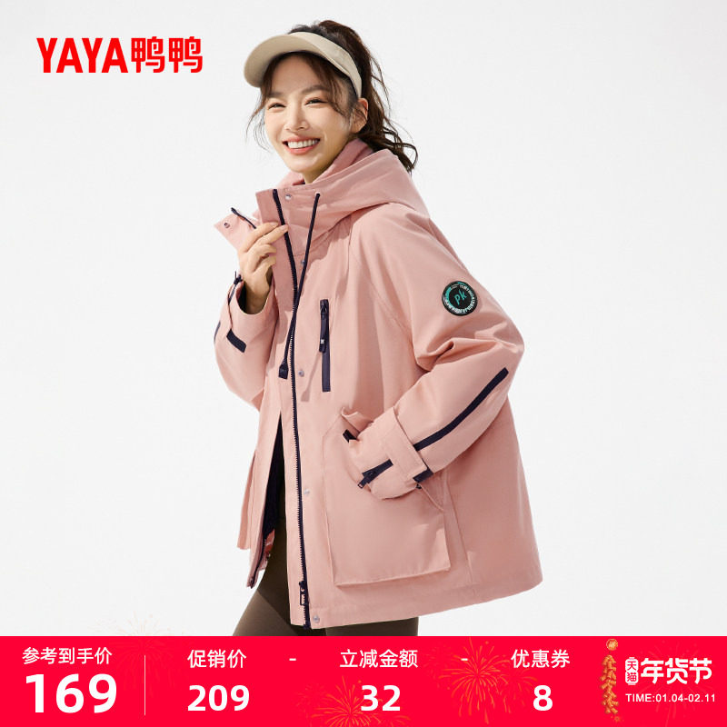 鸭鸭外套女士2025秋冬新款中长款连帽防风户外登山服风衣休闲夹克
